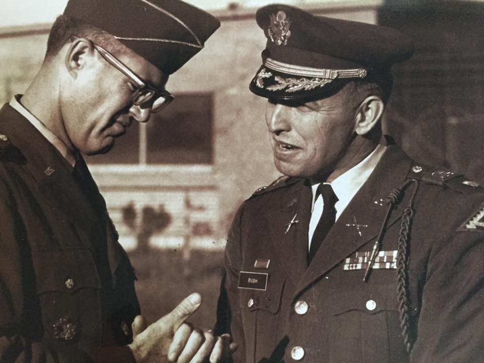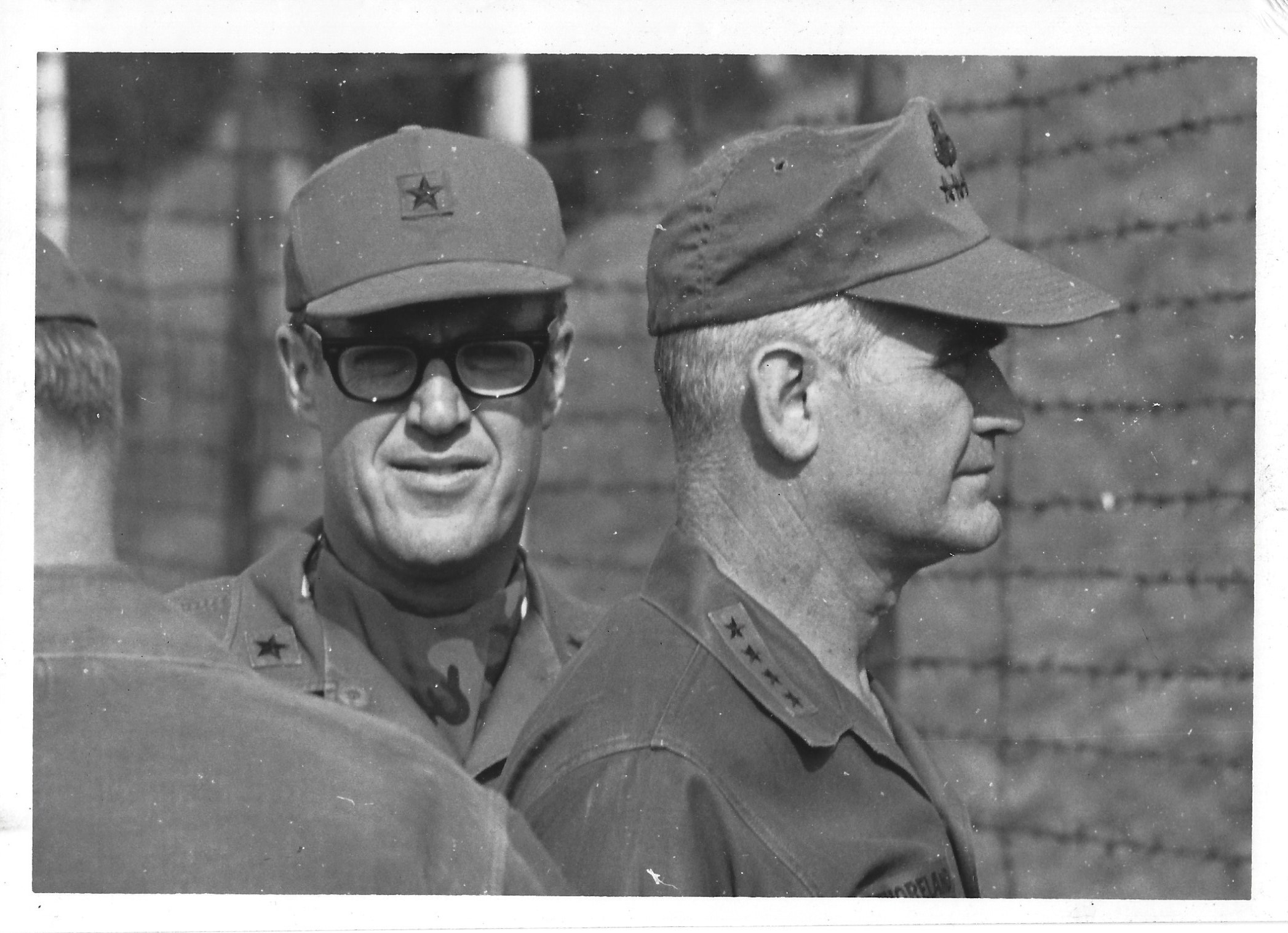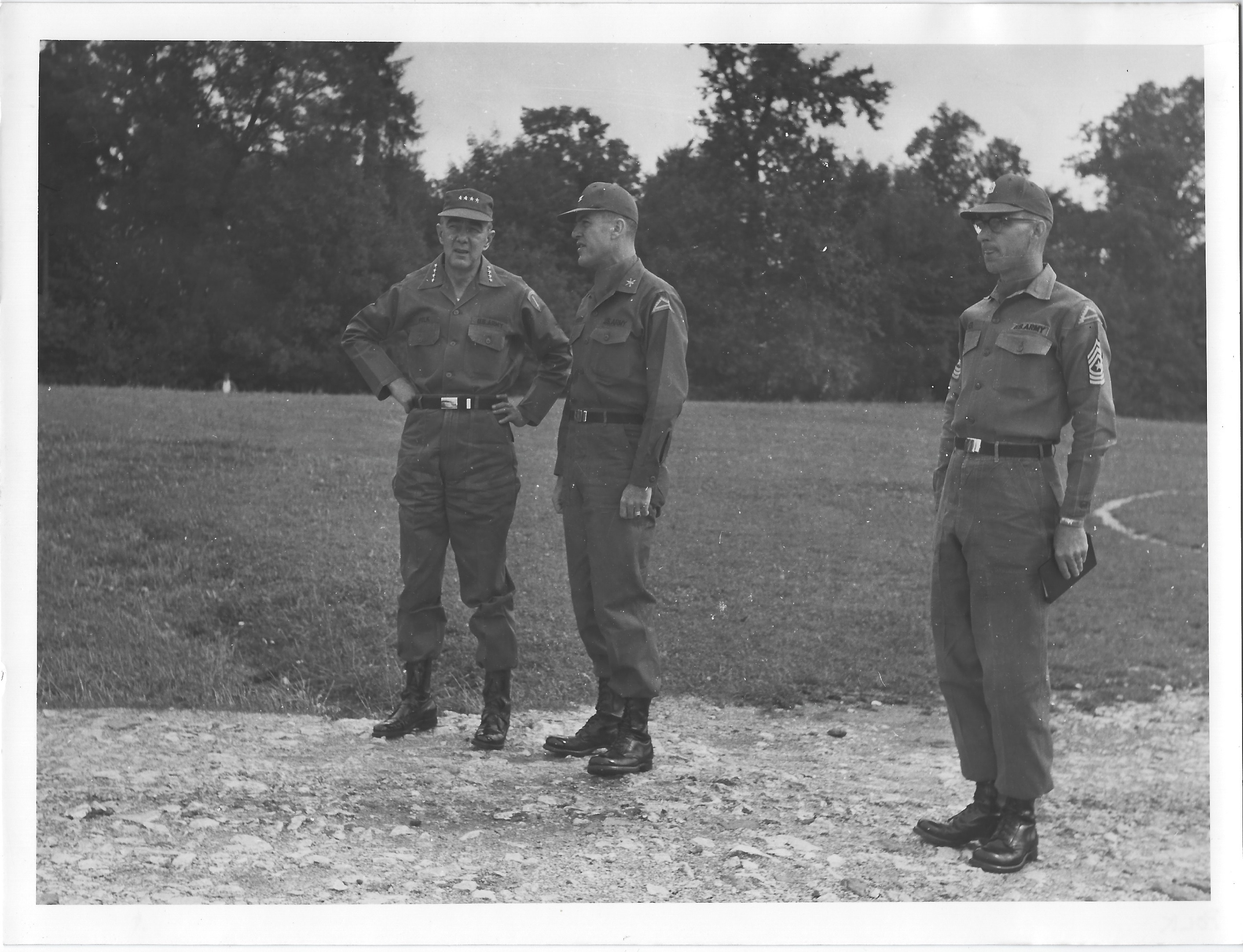 Gen. James H. Polk, left, Commander in Chief, United States Army Europe, and Col. Patrick W. Powers, middle, Commanding Officer, 56th Artillery Group (Pershing missile), Schwäbisch Gmünd, Germany, 1967-1968.