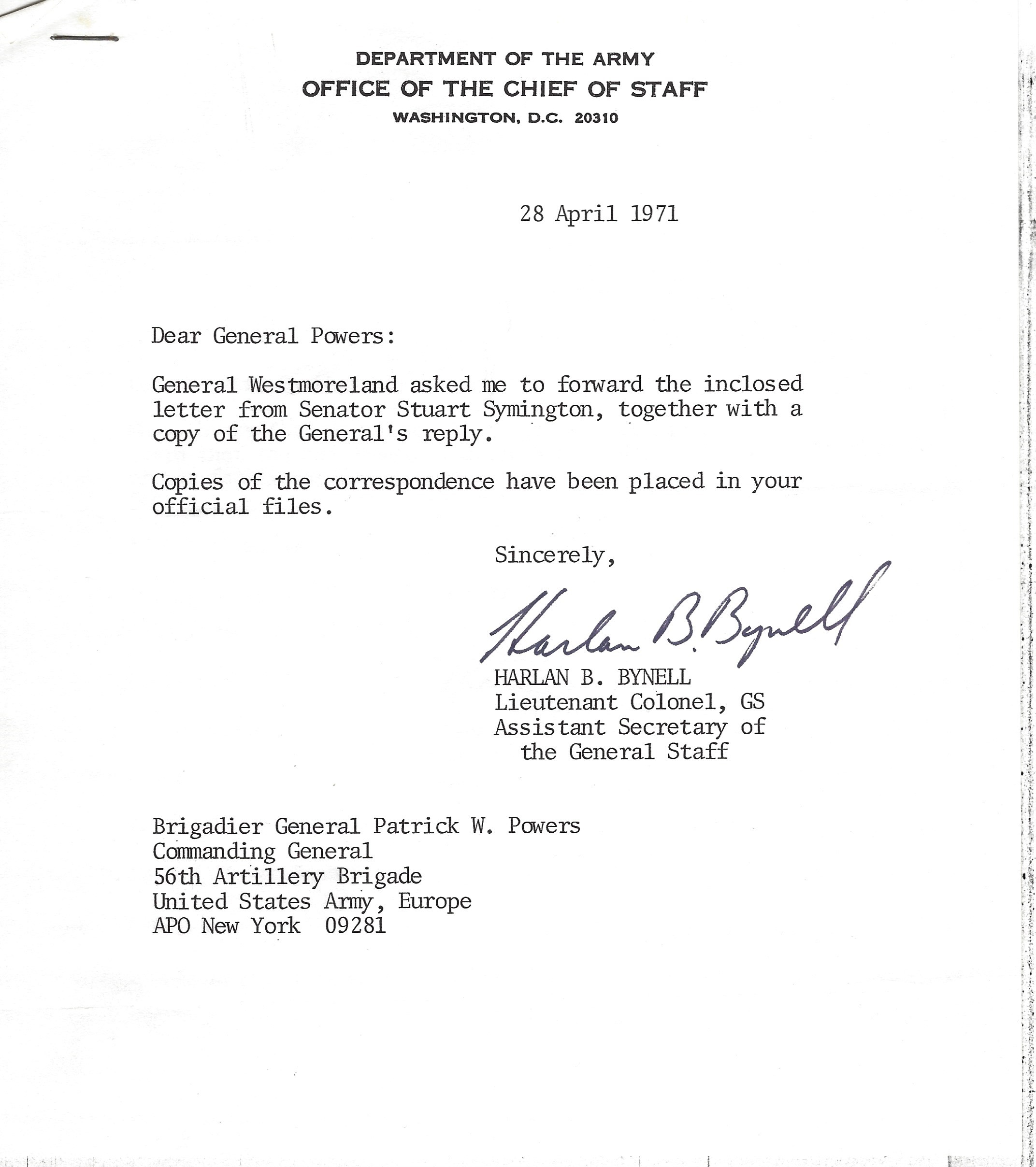 Letter from Lt. Colonel Harlan Bynell, Assistant Secretary of the General Staff, to B.G. Patrick W. Powers, about the letters from Gen. William Westmoreland and U.S. Senator Stuart Symington