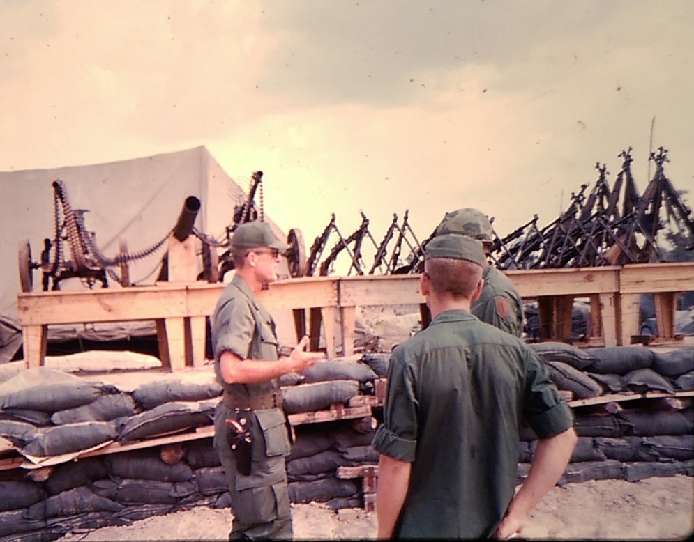 Col. Patrick W. Powers, to the left, Division Artillery Commander, Ist Infantry Division, USARV (Vietnam), with two Ist Infantry Division soldiers. At a Fire Support Base, with captured enemy weapons.