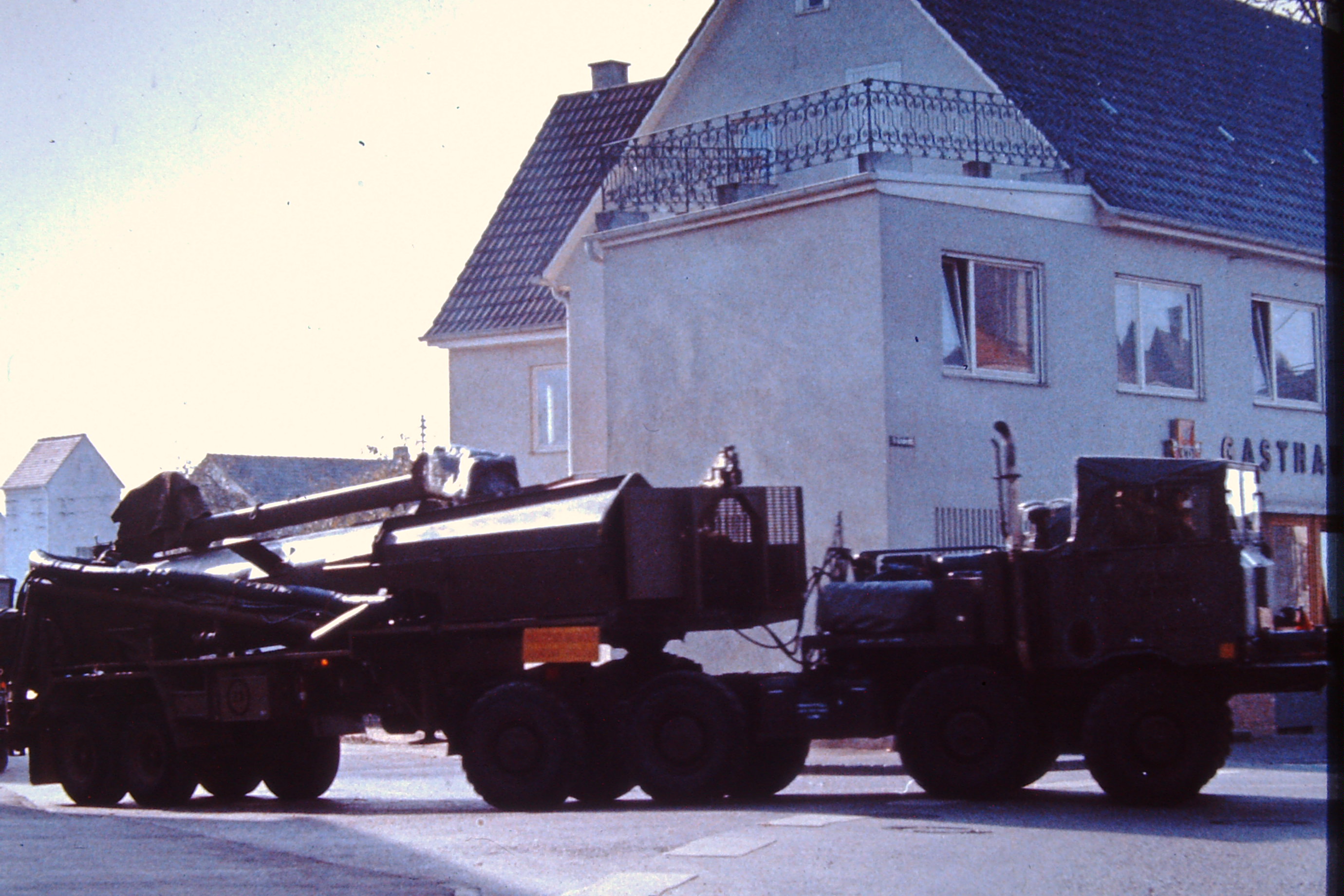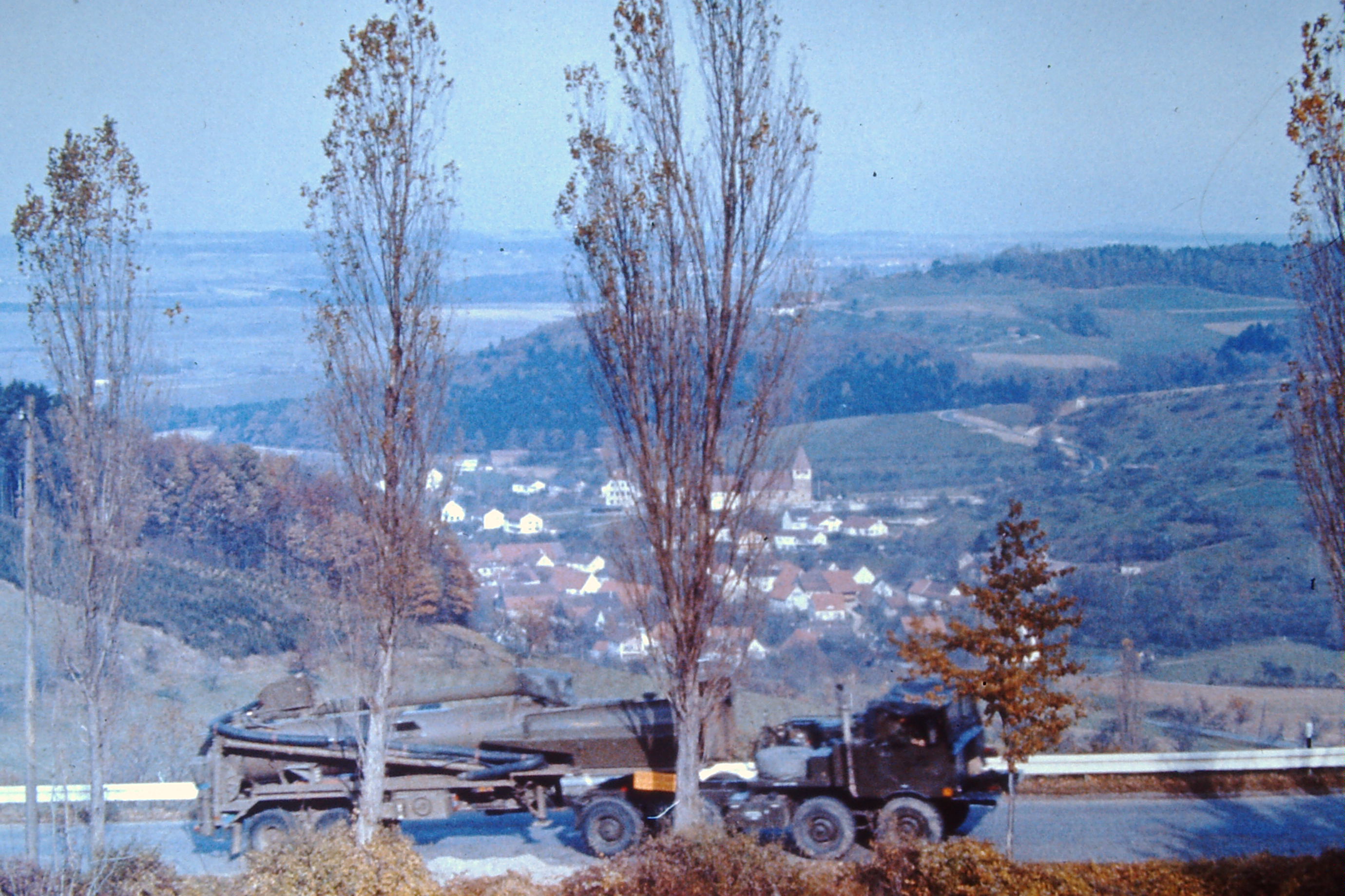 Photo showing a Pershing 1A missile on an erector launcher being transported by the 56th Artillery Brigade through the countryside near a West German town, about 1971. At that time, B.G. Patrick W. Powers was the Commanding General of the 56th Artillery Brigade (Pershing missile), headquartered at Bismarck Kaserne in Schwäbisch Gmünd, Germany. Photo taken from a 1971 slide show in the files of Gen. Powers.