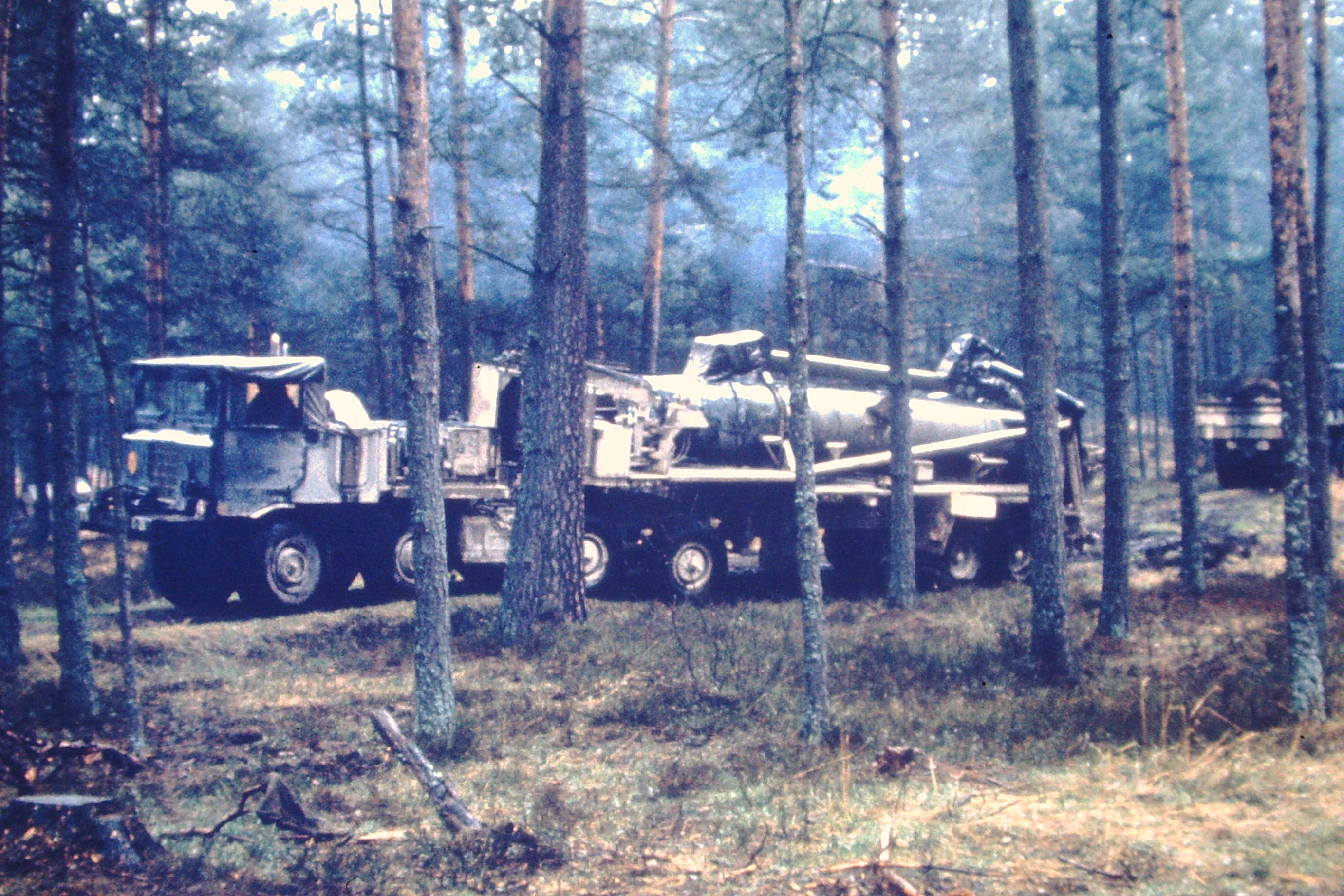 Photo showing a Pershing 1A missile on an erector launcher being transported through the woods by the 56th Artillery Brigade in West Germany, about 1971. At that time, B.G. Patrick W. Powers was the Commanding General of the 56th Artillery Brigade (Pershing missile), headquartered at Bismarck Kaserne in Schwäbisch Gmünd, Germany. Photo taken from a 1971 slide show in the files of Gen. Powers.