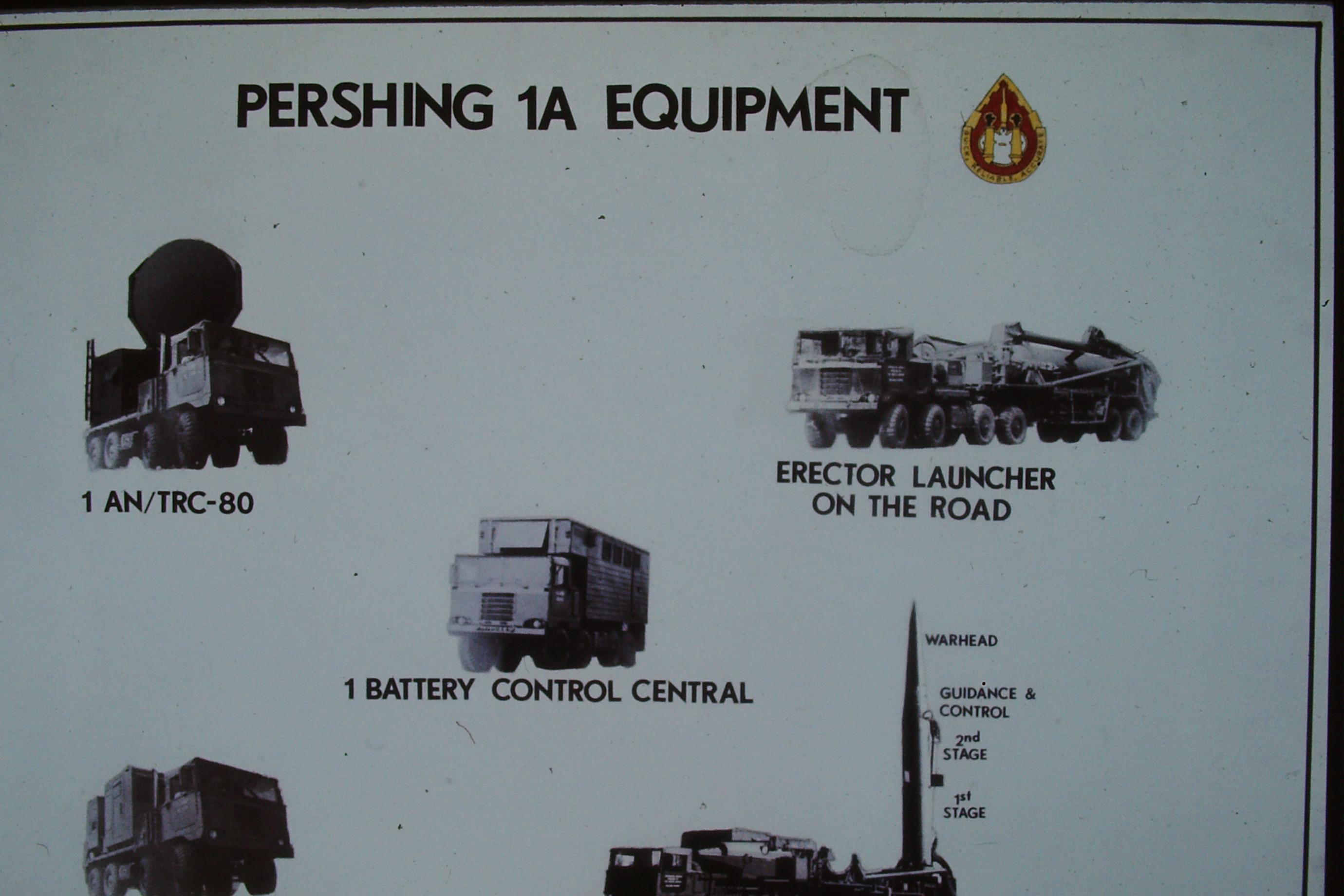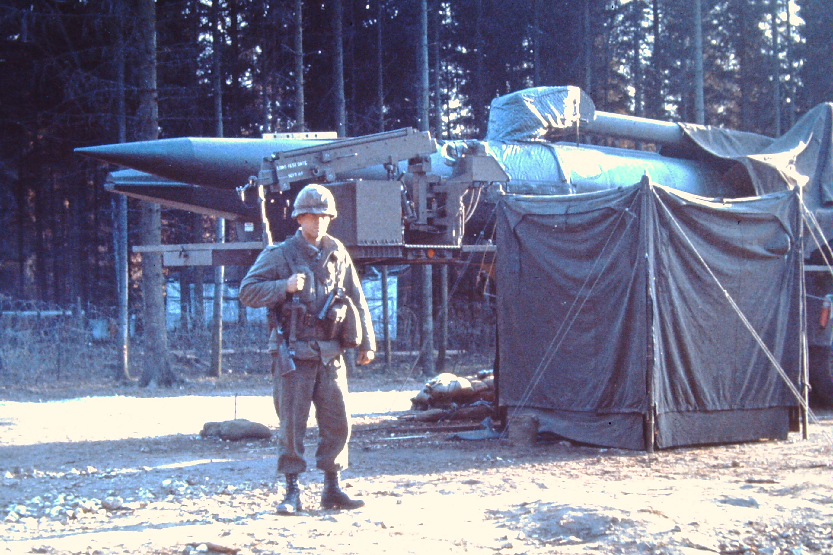 Pershing Missile in West Germany being guarded by a soldier from the 56th Artillery Brigade (Pershing missile), about 1971. At that time, B.G. Patrick W. Powers was the Commanding General of the 56th Artillery Brigade (Pershing missile), headquartered at Bismarck Kaserne in Schwäbisch Gmünd, Germany. Photo taken from a 1971 slide show in the files of Gen. Powers.