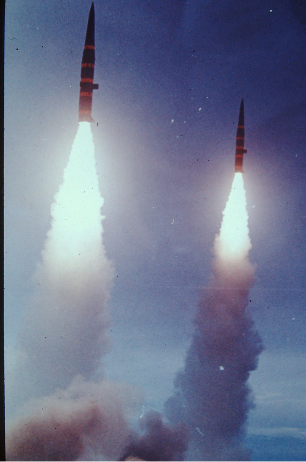 Two Pershing Missiles (Pershing 1A) being test fired by the 56th Artillery Brigade (Pershing missile), in the United States, about 1971. At that time, B.G. Patrick W. Powers was the Commanding General of the 56th Artillery Brigade (Pershing missile), headquartered at Bismarck Kaserne in Schwäbisch Gmünd, Germany. Photo taken from a 1971 slide show in the files of Gen. Powers.