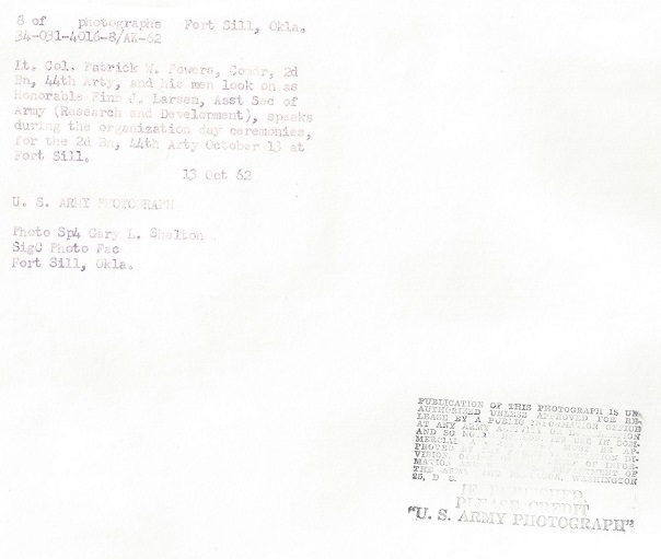 PowersLTCPatrickComdr13Oct1962FtSillOKOrganizationDayCeremony2ndBn44thArtyFinnLarsenAsstSecofArmyBackOfPhotocrp1