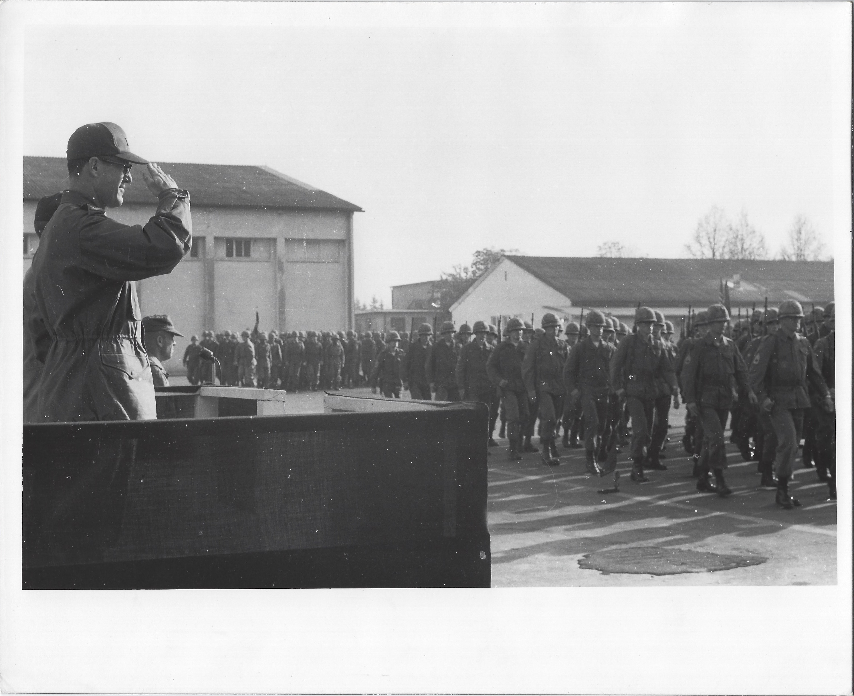 Col. Patrick W. Powers, Commanding Officer, 56th Artillery Group (Pershing missile), saluting troops, Schwäbisch Gmünd, Germany, 1967-1968.